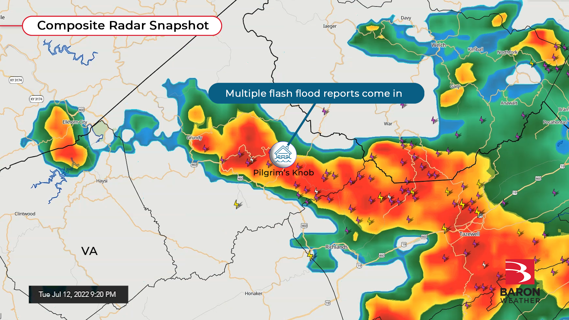 Les crues soudaines qui se sont produites dans le Tennessee et en Virginie - la même nuit la semaine dernière - ont entraîné de nombreux sauvetages dans l'eau, des routes emportées, des ordres d'évacuation, des maisons endommagées et même une opération de recherche et de sauvetage1. Les alertes aux crues éclair ont été émises au fur et à mesure du déroulement de l'événement. La modélisation à haute résolution de Baron a également permis d'annoncer plus d'une heure à l'avance qu'un événement important était sur le point de se produire.